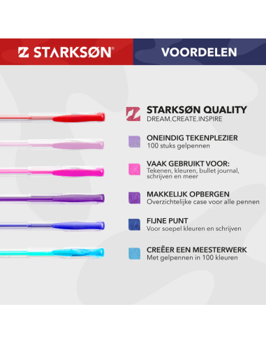 En STARKSØN®, nos esforzamos por ofrecer la más alta calidad y una garantía de satisfacción del 100%. Este completo set de dibujo con bolígrafos de gel de 100 piezas está elaborado con los más altos estándares de calidad, ¡para que puedas demostrar tu talento!