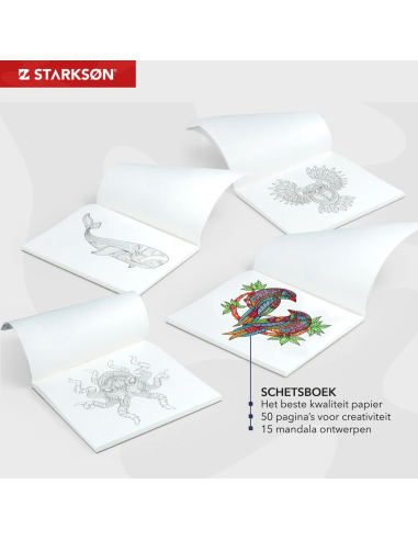 El set de dibujo incluye un cuaderno de dibujo profesional. El libro está hecho con papel de dibujo de alta calidad para que puedas crear los dibujos más hermosos. El libro contiene 50 páginas de 20 x 20 cm. De las 50 páginas, 15 tienen un diseño de mandala. ¡Las 35 páginas restantes están en blanco para tus propias creaciones!