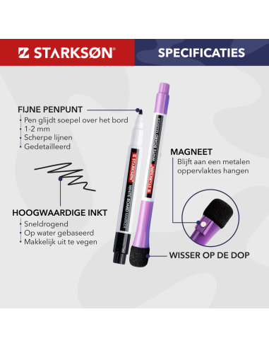 Set de 8 rotuladores con función borrador Starkson y elemento magnético para pizarra blanca con punta fina de 1-2 mm.