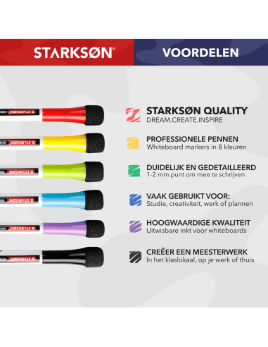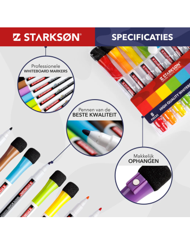 En STARKSØN®, nos esforzamos por ofrecer la más alta calidad y ofrecemos una garantía de satisfacción del 100 %. Este set de 8 marcadores está fabricado con los más altos estándares de calidad, lo que le permite crear las mejores notas, dibujos y otras obras de arte en una pizarra blanca.