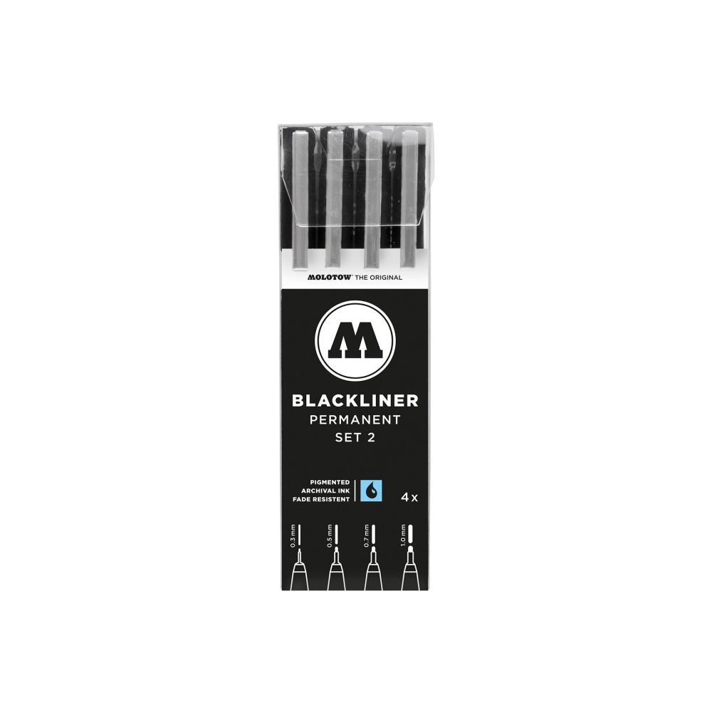 Pack de 4 Rotuladores calibrados negros de molotow Blackliner ideal para cualquier dibujante, esta compuesto por 4 rotuladores con diferentes grosores de Puntas: 0.3mm, 0.5mm, 0.7mm y 1.0mm.