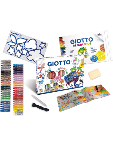 1 Álbum Giotto Kids A3 90g, 48 pásteles Olio maxi, 1 esponja, 1 difumino, 1 raspador y 1 guía creativa.