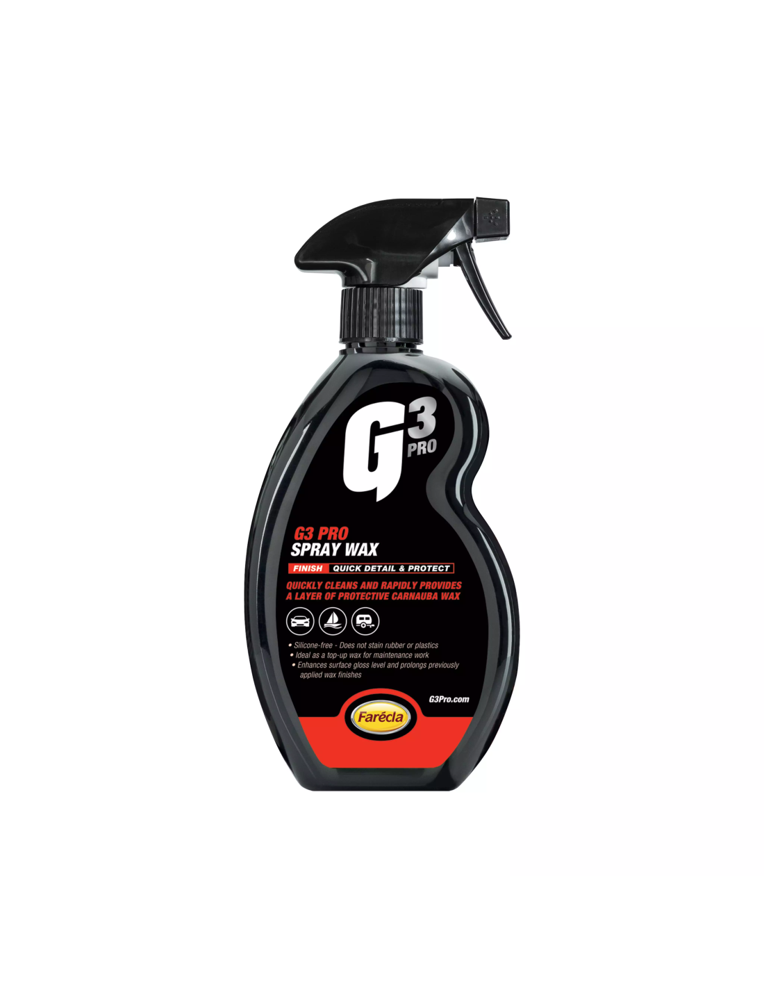 Cera en Spray G3 Pro proporciona rápidamente una capa de cera de Carnauba protectora en las superficies, dejando un acabado sin rayas con un brillo mejorado y extendiendo la protección de las ceras aplicadas previamente.