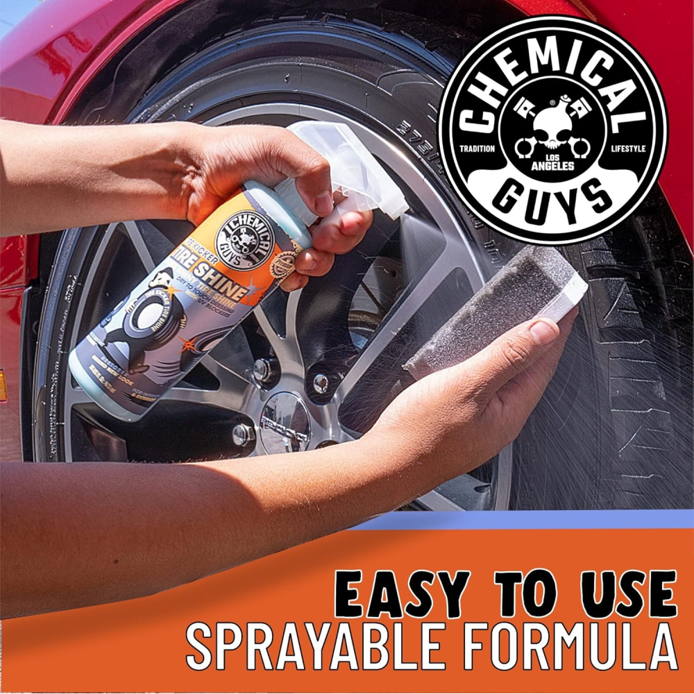 Tire Kicker de chemical Guys es un acondicionador a base de agua que recrea el brillo de un auto nuevo en tus neumáticos. También funciona en cualquier componente de goma, vinilo y plástico que se vea descolorido o opaco.