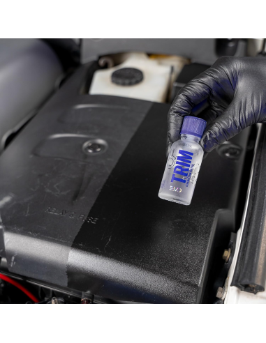 Gyeon Q2 Trim Kit para el sellado de plásticos rugosos, gomas y plásticos planos del coche. También funciona en faros de policarbonato, evitando la oxidación y la pérdida de transparencia. Está formulado a base de SiO2 cuarzo mezclado con agentes adherentes al plástico y gomas.