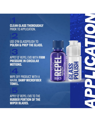 1 Gyeon Q2 Repel 30 ml, 1 Gyeon Q2 Cleanse 20 ml, 2 aplicadores, 4 toallitas de microfibra ultrafina.