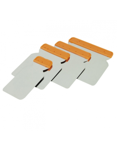 Espátulas muy útiles para la aplicación de masillas, con unas medidas de alto de 90 mm y anchura de 50, 80,100 y 120 mm.