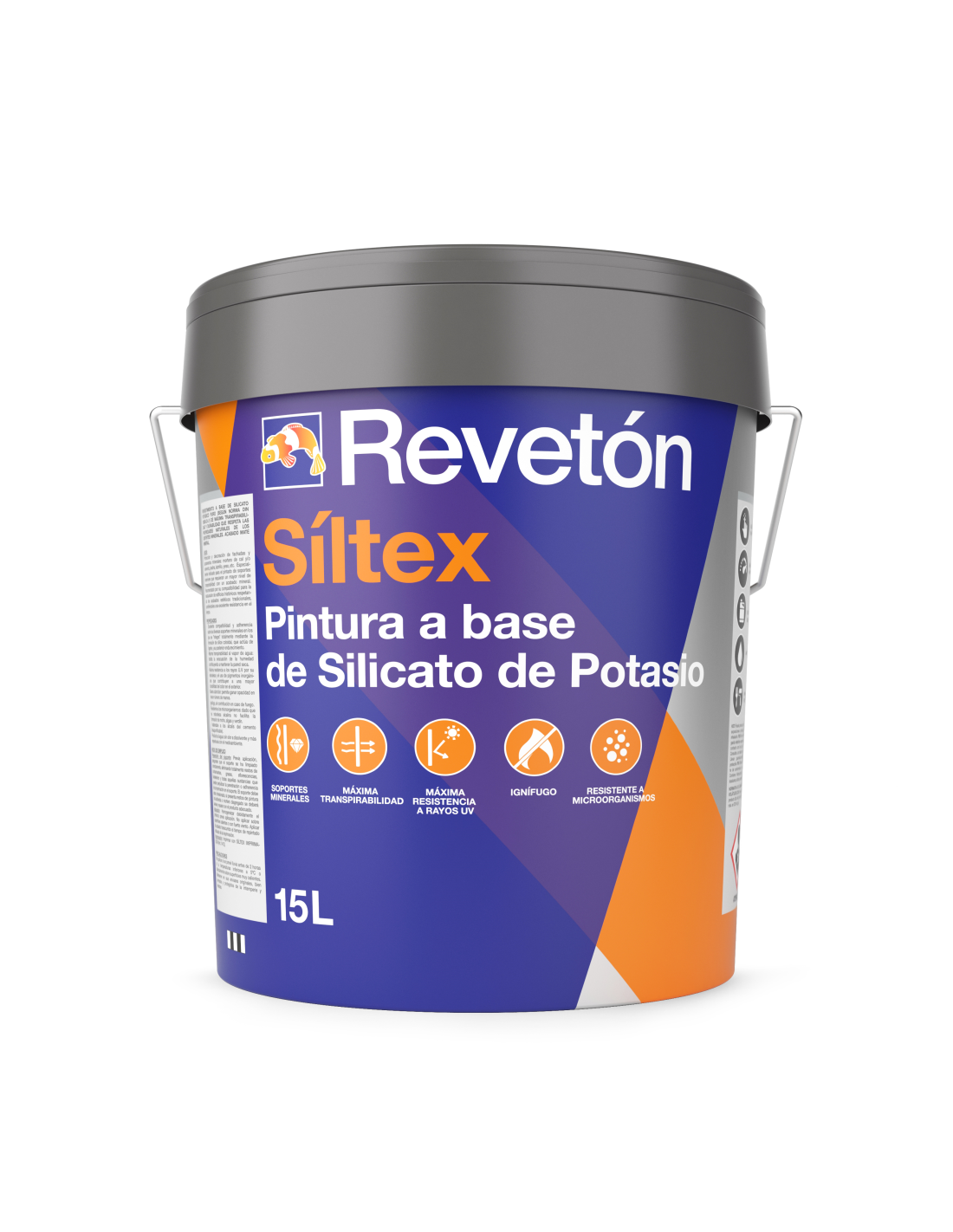 Revestimiento a base de silicato potásico puro (según Norma DIN 18363-2.4.1) SILTEX de Reveton, de máxima transpirabilidad y durabilidad que repete las propiedades naturales de los soportes minerales.