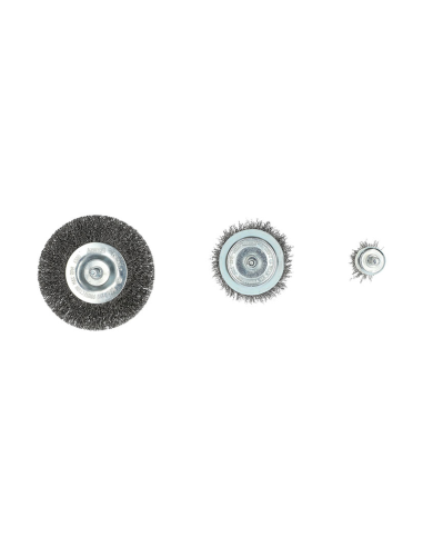 El kit contiene un cepillo circular, uno de copa y una brocha con eje para la limpieza con taladro.