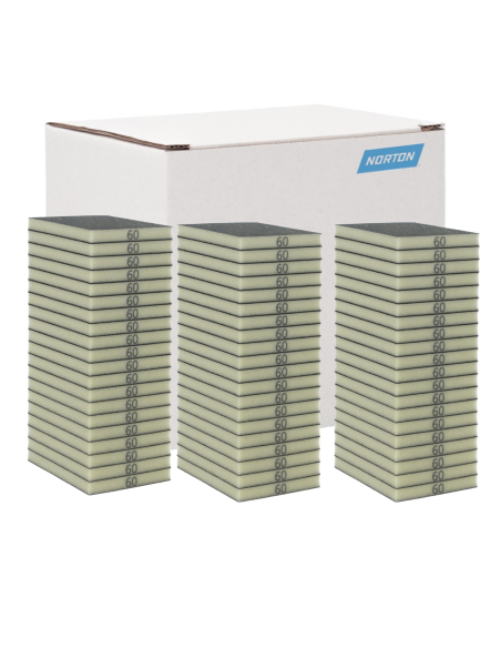 Caja 60 esponjas de lijar Norton doble cara abrasiva para el lijado de cualquier superficie, muy manejable, garantiza resultados excelentes en madera, plásticos, pinturas, barnices y materiales compuestos, puede ser usado en húmedo y en seco.