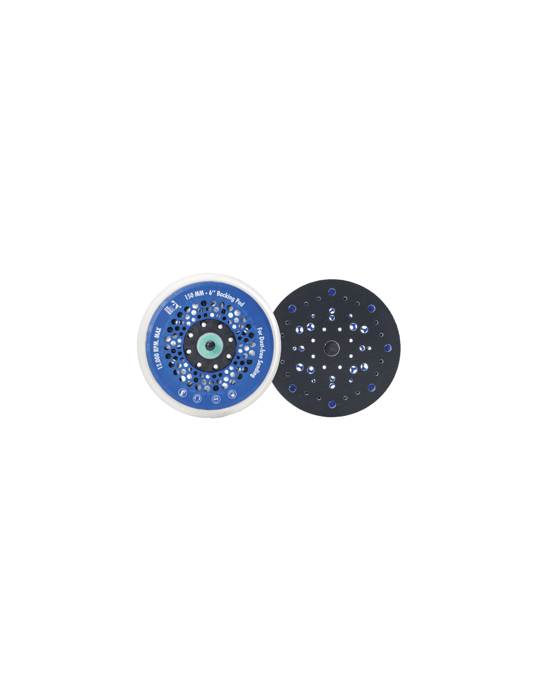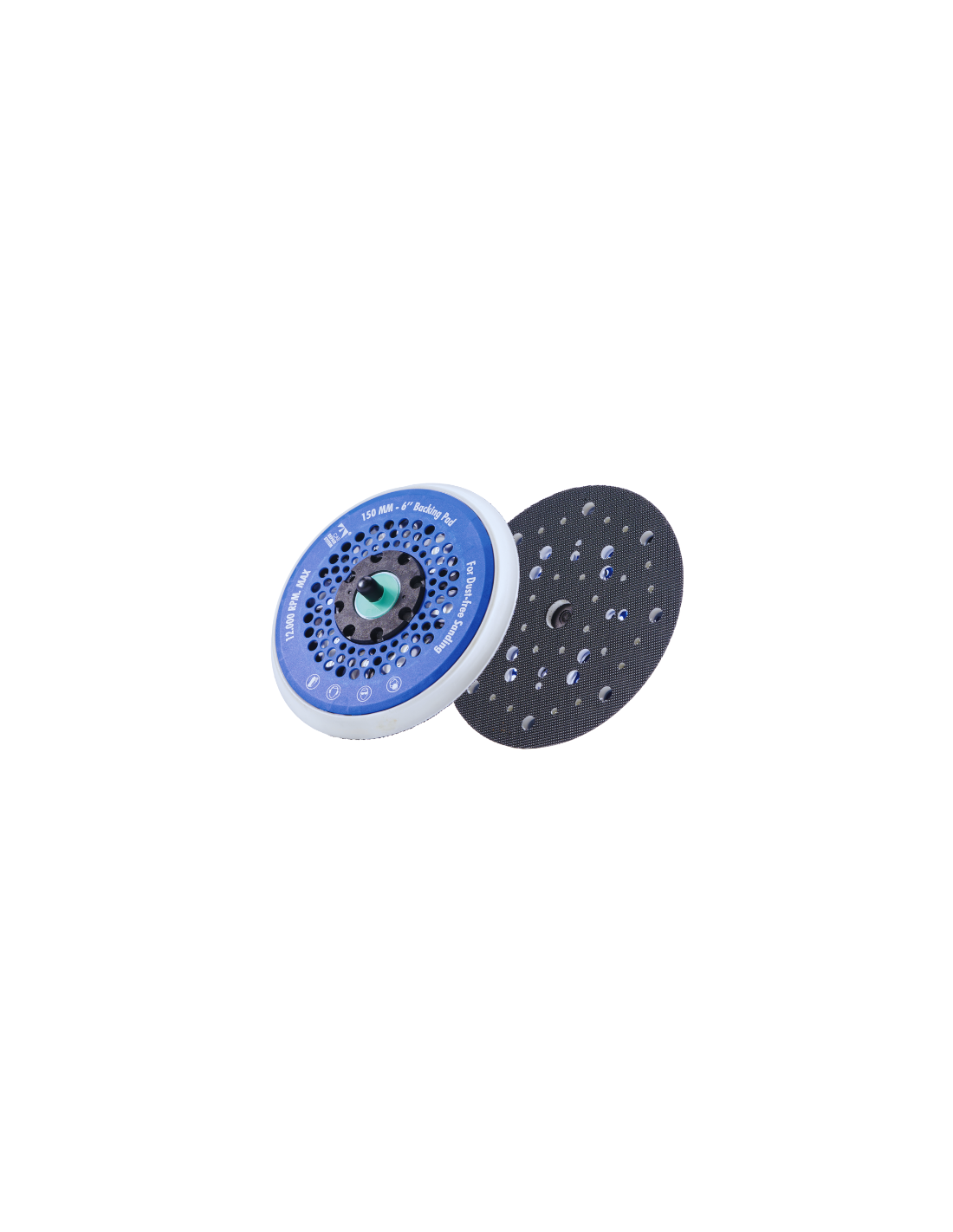 Plato con base de velcro y diámetro de 150 mm y métrica 5 con un sistema multicanal de aspiración que logra una eliminación total del polvo de la superficie de trabajo.